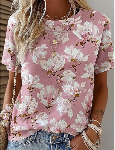 Mulheres Camiseta Imprimir Floral Gráfico Plantas Vintage à moda Clássico Manga Curta Gola Redonda Decote Redondo Tops regulares Diário Final de semana Amarelo Rosa Arco-íris Verão Primavera