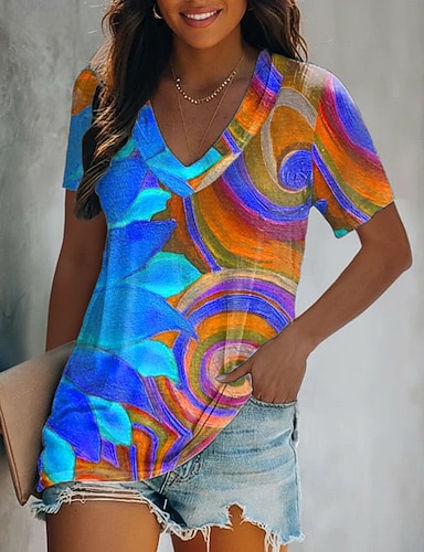 Mulheres Camiseta Imprimir Gráfico Geometria Vintage à moda Clássico Manga Curta Decote V Tops regulares Casual Diário Para Noite Azul Amarelo Roxo Laranja Verão Primavera