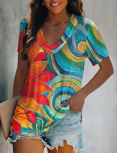 Mulheres Camiseta Imprimir Floral Bloco de cor Vintage Casual Boho Manga Curta Decote V Tops regulares Diário Arco-íris Verão Primavera