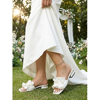 Sandálias rasteiras femininas brancas com estampa floral, modelo slip-on com laço de pérolas e bico aberto, elegantes sapatos para noivas em casamentos no jardim.