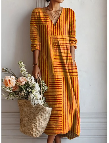 Vestido Maxi Feminino Linho Vestido Casual Diário Solto Gráfico Geométrico Abstrato Manga Longa Decote em V Azul Roxo Laranja Verde Verão Primavera