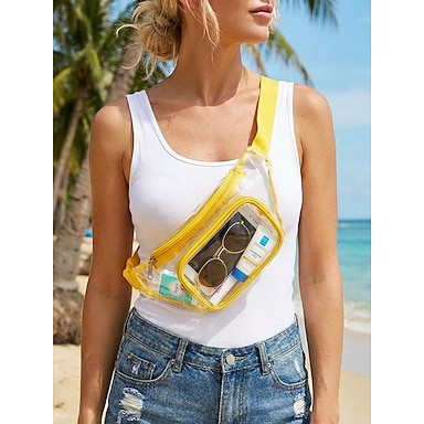 Bolsa transversal ou de cintura feminina transparente em PVC, multicolorida, com alça ajustável e múltiplas opções de uso. Bolsa elegante e espaçosa, ideal para férias na praia e uso casual no dia a dia.