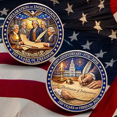 Moeda comemorativa do 250º aniversário dos EUA, com o desenho da Declaração de Independência e o símbolo da liberdade. & águia &Moeda comemorativa do 1776-2026, com a bandeira patriótica em destaque.