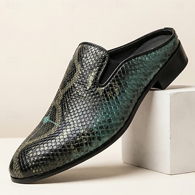 Mocassins masculinos verdes com estampa de pele de cobra, modelo slip-on, elegantes e formais, ideais para casamentos, banquetes, festas, formaturas, baladas e para quem busca um estilo sofisticado e marcante.