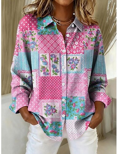 Mulheres Camisa Social Patchwork Botões Imprimir Floral Gráfico Vintage à moda Moderno Manga Longa Colarinho de Camisa Tops regulares Diário Azul Rosa Verão Primavera
