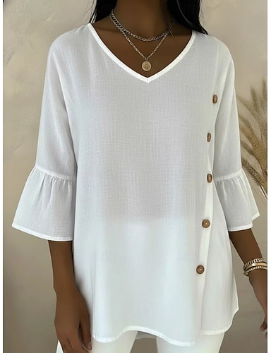 Mulheres Camisa Social Blusa Camisa de algodão Tecido à moda Clássico Moderno Meia Manga Decote V Tops regulares Diário Feriado Para Noite Preto Branco Amarelo Azul Marinha Azul Claro Verão Primavera