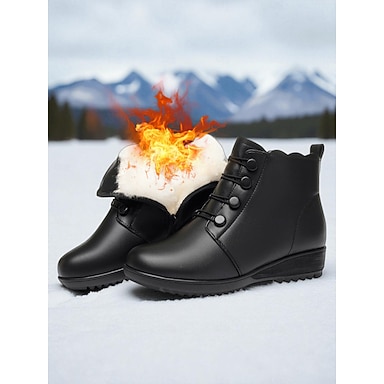 Botas femininas de couro preto com forro de lã – fecho de zíper, botas de inverno quentes e confortáveis para uso casual e ao ar livre