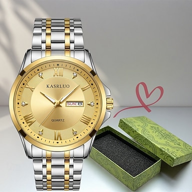 Relógio masculino de luxo para negócios, relógio de pulso de quartzo bicolor em aço inoxidável com dia e data, relógio analógico com numerais romanos com caixa de presente, relógio elegante e à prova