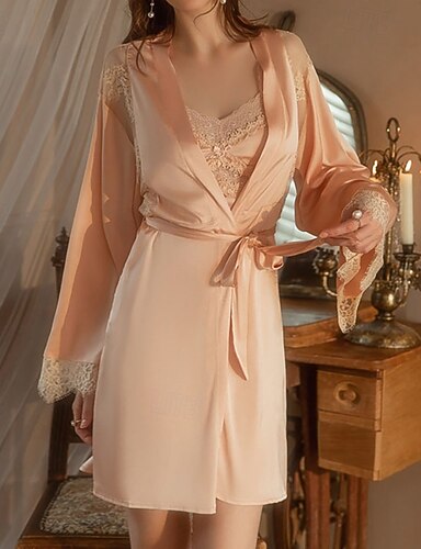 Mulheres Loungewear Camisola Moda Casual Cor imaculada Pijama de cetim sedoso Renda Patchwork Vestidos Casa Férias Manga Longa Decote V Preto Branco Verde Claro Rosa Roxo Outono Inverno Moderno