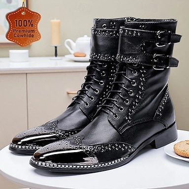 Botas de combate masculinas com cadarço - pretas com detalhes prateados, design arrojado, ideais para uso casual e aventuras ao ar livre.