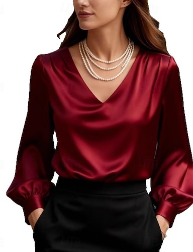 Mulheres Blusa de cetim Saia Blusa Elegante Moda Trabalho Manga Longa Bispo Decote V Diário Ao ar livre Trabalho Preto Branco Vinho Bege Primavera Outono
