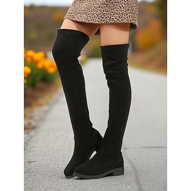 Botas femininas pretas acima do joelho – botas de inverno de camurça sintética com salto baixo para streetwear e looks casuais