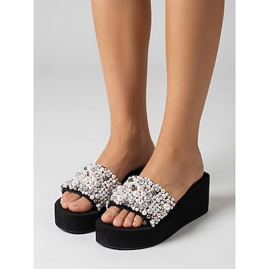 Sandálias plataforma pretas femininas - sapatos de verão estilosos com detalhes em pérola sintética, perfeitas para férias na praia, festas em resorts e viagens para destinos tropicais.