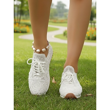 Tênis feminino branco de malha com cadarço – calçado leve, respirável e confortável para caminhadas, ideal para férias em resorts, viagens à praia e uso diário.