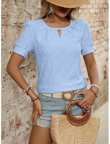 Mulheres Camiseta T-shirt Ilhó Tecido Moda à moda Clássico Manga Curta Gola Redonda Tops regulares Diário Para Noite Final de semana Azul Preto Rosa Verde Bege Verão Primavera