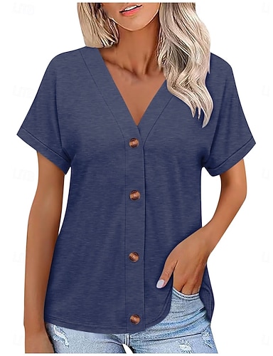 Mulheres Camiseta T-shirt Botões Tecido Moda à moda Clássico Manga Curta Decote V Tops regulares Diário Para Noite Final de semana Azul Preto Branco Rosa Azul Marinha Verão Primavera