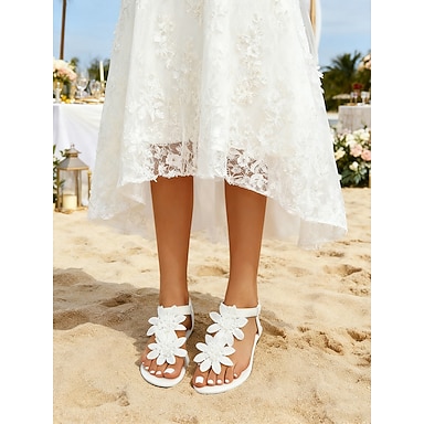 Sandálias femininas brancas com aplicações de flores e miçangas - elegantes sapatos rasos para casamentos na praia e para noivas. &Calçado de verão para damas de honra para eventos ao ar livre na