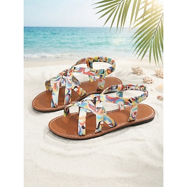 Sandálias rasteiras femininas boho com estampa abstrata colorida - confortáveis, com tiras cruzadas e elástico no calcanhar, perfeitas para férias na praia e viagens de verão. &relaxar à beira da