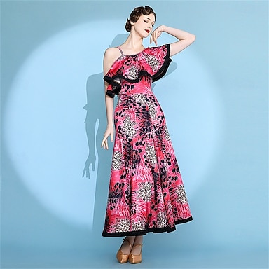 vestido de dança de salão com estampa floral e ombros à mostra para mulheres - vestido de corte A com babados para competições, dança latina e eventos de dança - rosa & preto
