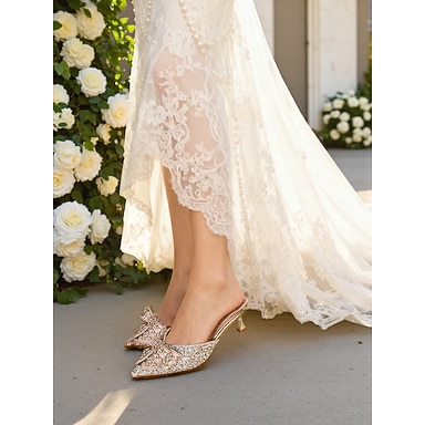 Sapatos de noiva mule femininos com strass brilhantes e laço de pérolas, elegantes sapatos de casamento de bico fino, perfeitos para casamentos ao ar livre no jardim. &cerimônias no gramado