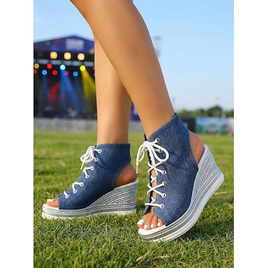 Sandálias femininas de plataforma com cadarço em jeans – modelo espadrille de bico aberto, ideais para festivais de música, férias e uso casual ao ar livre.