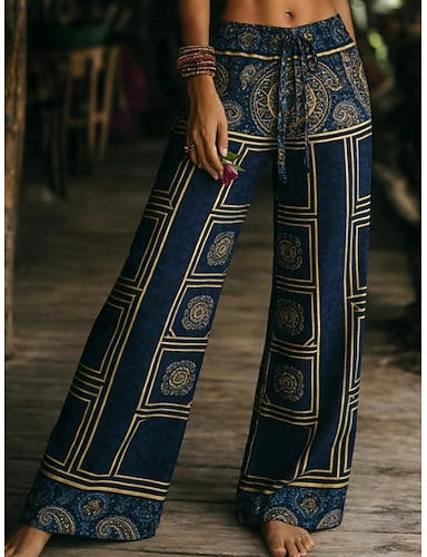 Mulheres Perna larga Calças Moda Roupa de rua Boho Comprimento total Cintura Média Gráfico Geométrica Bolsos Cintura elástica Imprimir Confortável Respirabilidade Micro-Elástica Diário Ao ar livre