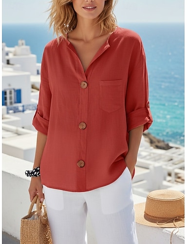 Mulheres Camisa Social Camisas de algodão e linho Blusa Linho de algodão sintético Bolsos Botões Tecido Ativo à moda Manga 3/4 Decote V Tops regulares Diário Streetwear Feriado Preto Roxo Laranja