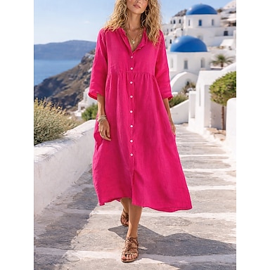 Mulheres Vestido midi Linho de algodão sintético Camisetão Vestido casual Moda Ao ar livre Festa Feriado Normal Tecido Manga Longa Gola Redonda Verde Claro Rosa Cinzento Verão