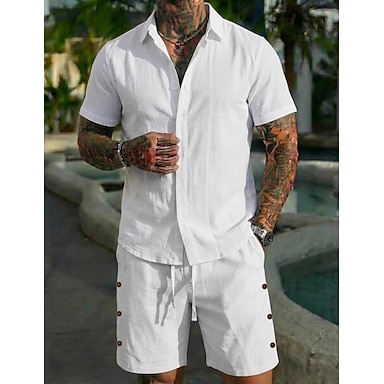 Masculino Camisa de linho camisa de botão E Shorts de linho Definir Tecido Casual Diário Ao ar livre Aberto para a Lateral Manga Curta Verão Moda Casual Confortável Roupa