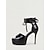Sandálias femininas pretas de verniz com plataforma e salto alto, modelo scarpin com amarração no tornozelo, perfeitas para festas noturnas e baladas. &looks ousados para a noite
