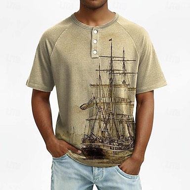 Homens Carro Camisa Henley Manga Curta Impressão 3D Férias Retro Vintage Festa Rua Verão Primavera Amarelo cáqui Gola Redonda Camiseta Henley