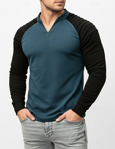Camiseta masculina de camurça sintética, manga longa, decote em V, design franzido, pregas, estilo vintage retrô, para o outono/inverno, com blocos de cores, ideal para uso diário, casual urbano, nas