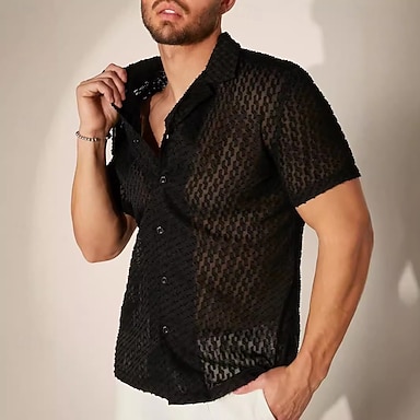 Homens Camisa Social Camisa casual camisa de botão Preto Manga Curta Tecido colar cubano Casual Diário Jacquard Roupa Poliéster Elegante Moda Casual