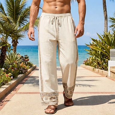 Homens Calças de linho Calças Calça verão Calças largas Calças de praia Com Cordão Cintura elástica Imprimir Geométrica Tecido Conforto Respirável Comprimento total Diário Praia Feriado Moda Boêmio