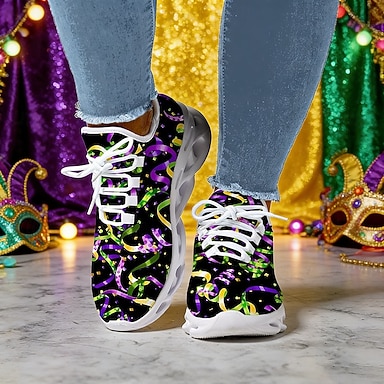 Womens Mardi Gras Tênis Athletic com Estampa de Confete e Cadarço - Calçados Festivos Confortáveis e Almofadados para Desfiles de Carnaval Celebrações de Rua Recados Diários e Atividades ao Ar Livre