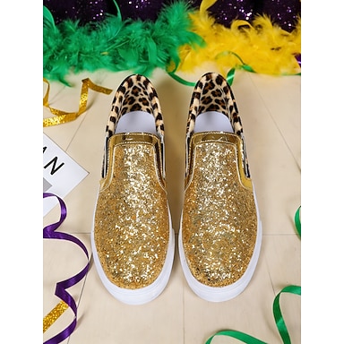 Tênis slip-on feminino dourado com glitter e detalhe de estampa de leopardo, modelo plataforma, ideal para festas de carnaval.