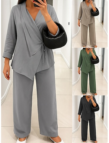 Mulheres Conjuntos de calças Manga Longa Decote V Tecido Franzido Cordões Elegante Moda Roupa de rua Casual Diário Ao ar livre Preto Verde Cáqui Verão Normal