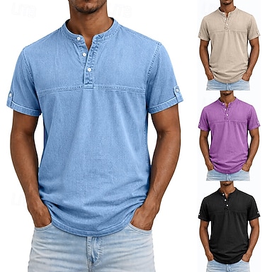 Homens Camisa Henley Camisa 100% algodão com lavagem ácida Manga Curta Tecido Retro Vintage Casual Estilo vintage Tingimento em peça Lavado Henley Casual Primavera Verão Verão Primavera Preto Azul