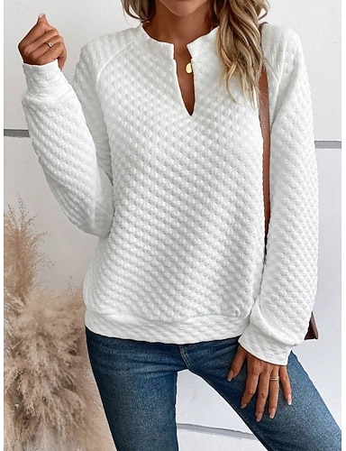 Mulheres Camisa Social Blusa Ilhó Tecido à moda Casual Manga Longa Decote V Tops regulares Diário Branco Primavera Outono