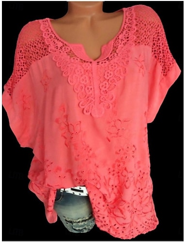 Mulheres Camiseta Renda Patchwork Tecido Moda à moda Clássico Manga Curta Decote V Tops regulares Diário Final de semana Azul Preto Branco Vermelho Cinzento Verão Primavera