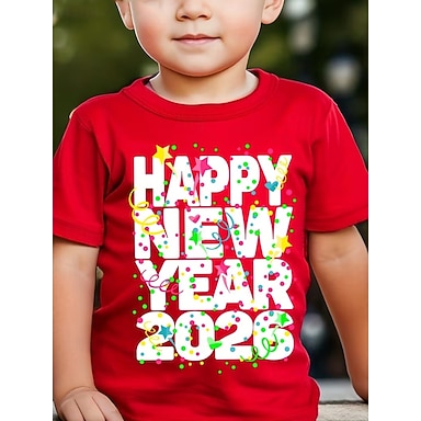 Camiseta infantil de algodão para meninos, com estampa de letras em preto e vermelho, para a festa de Ano Novo de 2026. &Camiseta com estampa de número, blusa, gola redonda, manga curta, para uso