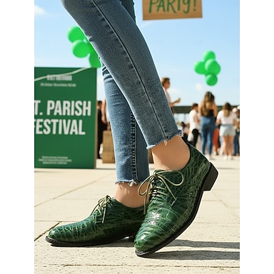 Sapatos Oxford femininos verdes com imitação de crocodilo – sapatilhas de salto baixo com cadarço para o desfile do Dia de São Patrício e para trajes de festivais irlandeses. &celebrações de feriados