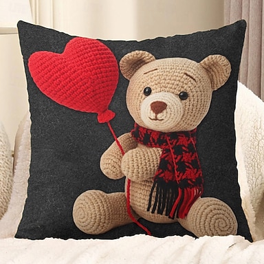 Capa de almofada escura com estampa plana 2D para o Dia dos Namorados, urso segurando um balão em forma de coração vermelho, adorável presente para o Dia dos Namorados, capa de almofada decorativa