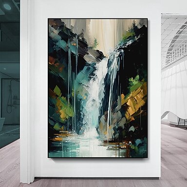 Pintura a óleo original feita à mão de alta montanha em tela, arte de parede, pintura abstrata de paisagem de cachoeira para decoração de casa com moldura esticada/sem pintura de moldura interna