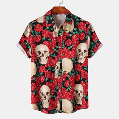 Homens Caveiras Flores Camisa Social camisa de verão Camisa casual Manga Curta Vintage Terror Férias Roupa Diária Festa temática Primavera Verão Lapela Imprimir Branco+Preto Preto Branco Vermelho Azul