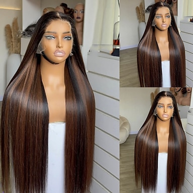 Cabelo virgem não processado 13x4 Lace Front Peruca Parte livre Cabelo Brasileiro Liso Seda Marrom Ruivo Peruca 130% 150% Densidade do Cabelo com o cabelo do bebê Riscas Naturais Sem cola Pré-depenado