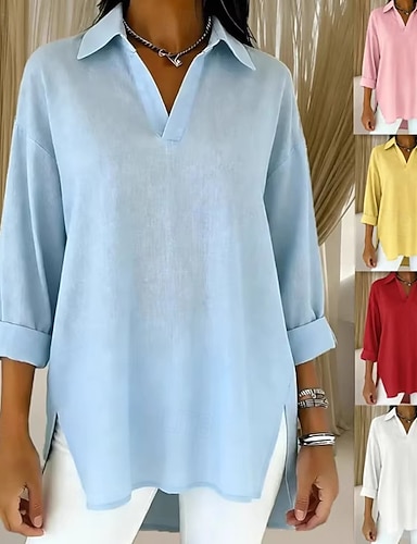 Mulheres Camisa Popover Camisa casual Blusa Côr Sólida Férias à moda Básico Manga Longa Aberto para a Lateral Decote V Tops regulares Diário Ao ar livre Trabalho Azul Branco Amarelo Rosa Vermelho