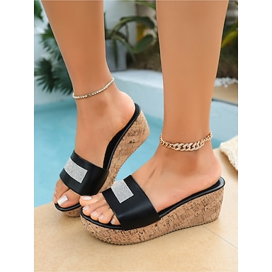 Sandálias anabela pretas femininas elegantes - sandálias confortáveis com plataforma em cortiça e detalhes brilhantes em strass, perfeitas para férias em hotéis de luxo e festas à beira da piscina.