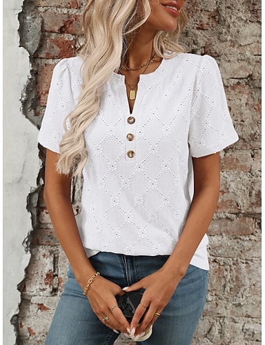 Mulheres Camiseta T-shirt Botões Tecido Moda à moda Clássico Manga Curta Decote V Tops regulares Diário Para Noite Final de semana Preto Branco Rosa Roxo Verão Primavera