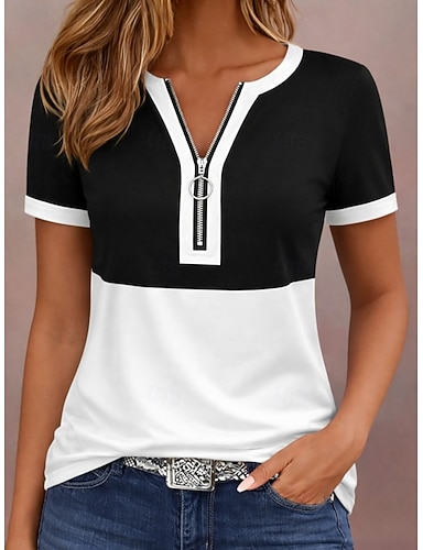 Mulheres Camiseta Zíper Quarter Zip Gráfico Geométrica Bloco de cor Tropical Havaiana à moda Manga Curta Gola Redonda Decote V Tops regulares Diário Esportes Para Noite Branco e Preto Preto Arco-íris